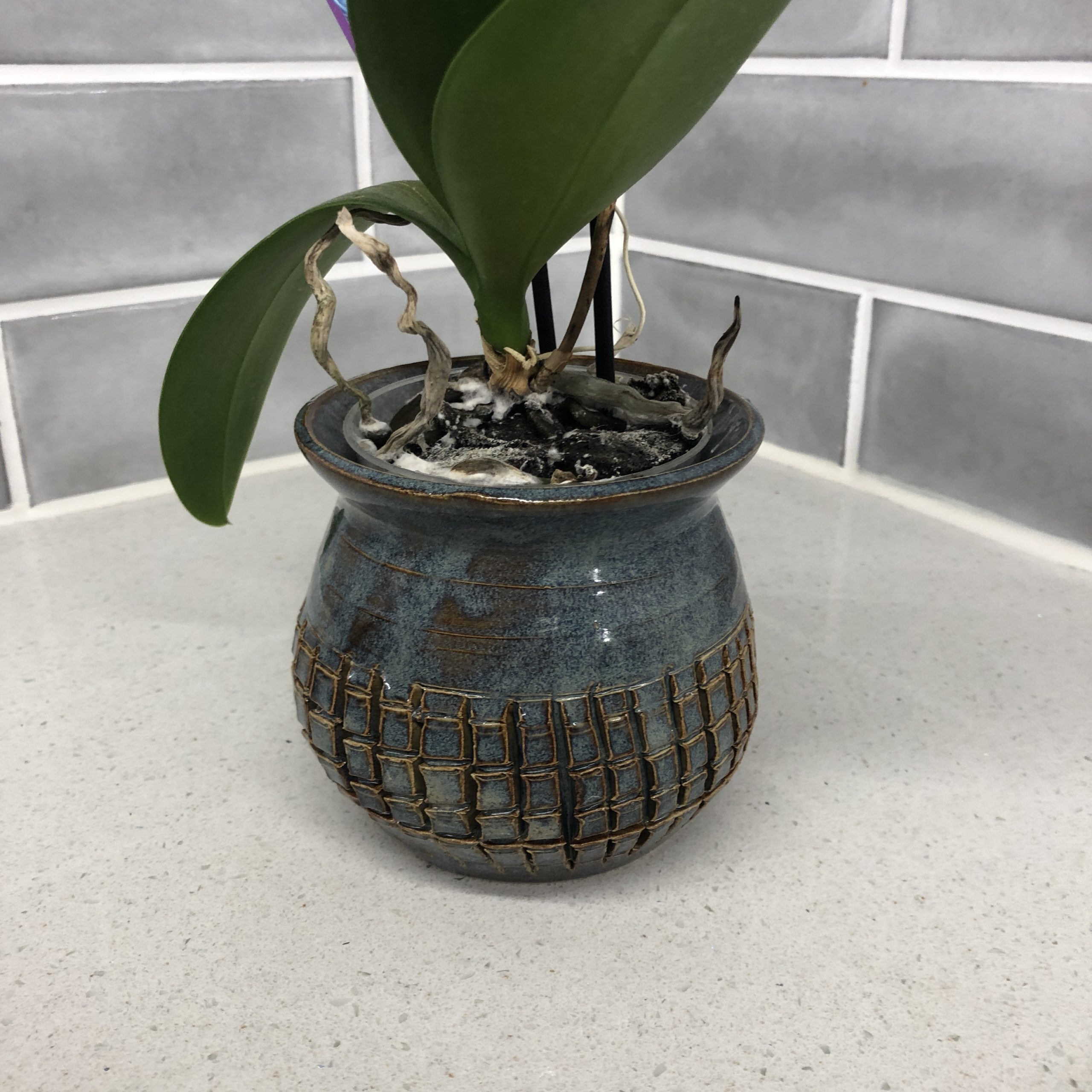 Need a great gift? This plant pot holds an orchid plant available at your local grocery store. It is glazed in variegated blue. Dishwasher, microwave, and oven safe.